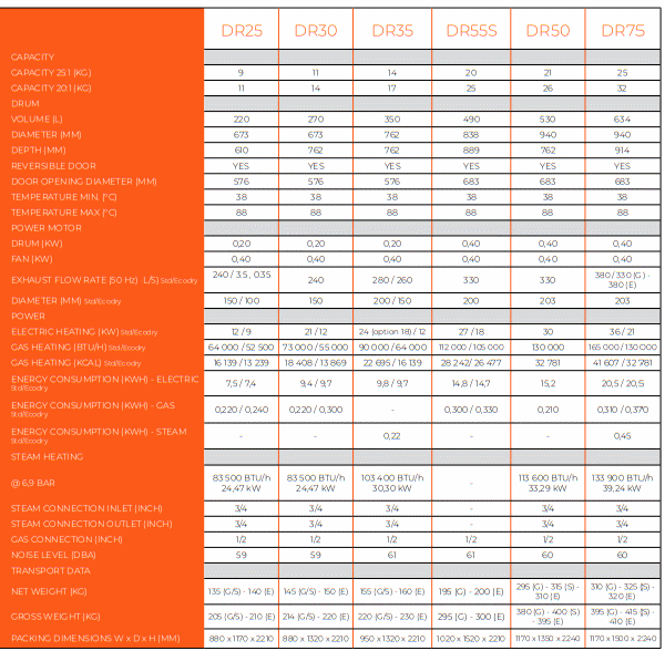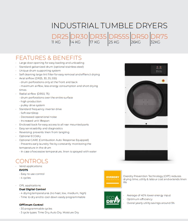La gamma di asciugabiancheria presenta un flusso d’aria concentrato e cerchi a cilindro sigillati per garantire il massimo utilizzo dell’aria e il risparmio energetico. Questa prestazione di asciugatura superiore aiuta le lavanderie a massimizzare la produttività.
